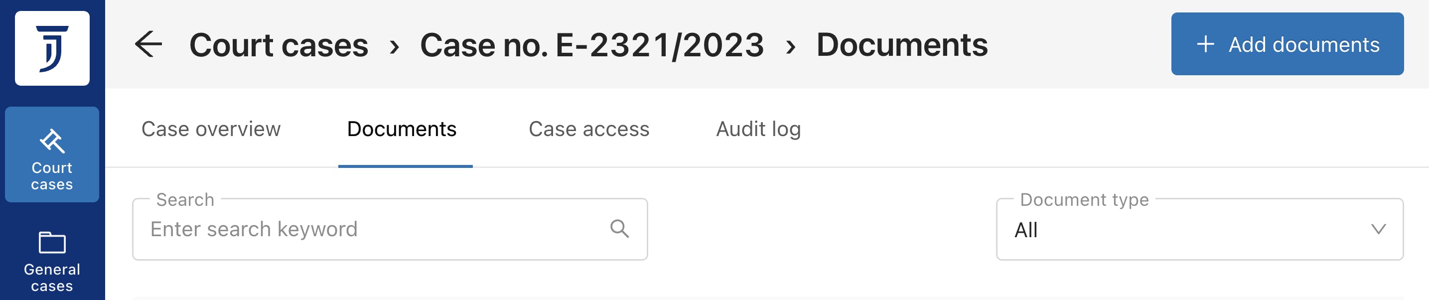 Once you’ve selected the case from the "My Cases" overview and opened it, navigate to the “Documents” tab at the top of the page. This section provides an overview of all documents submitted in the case so far.