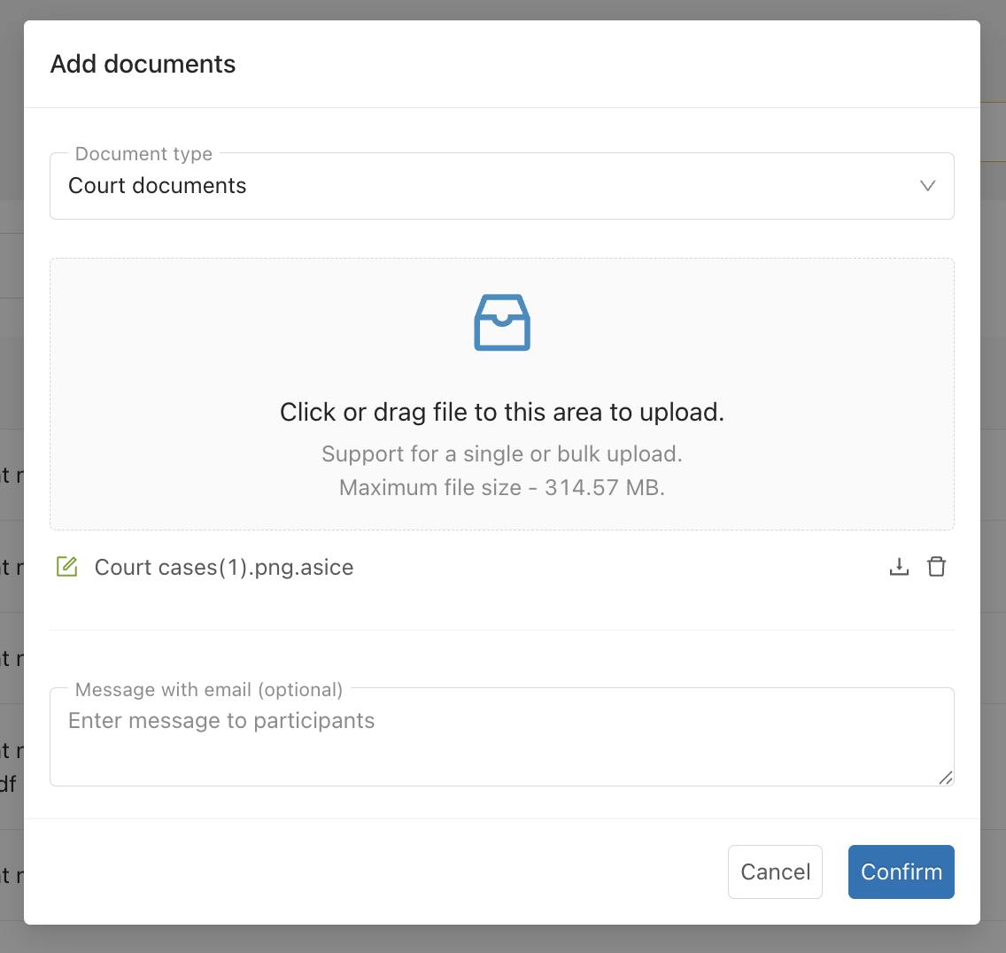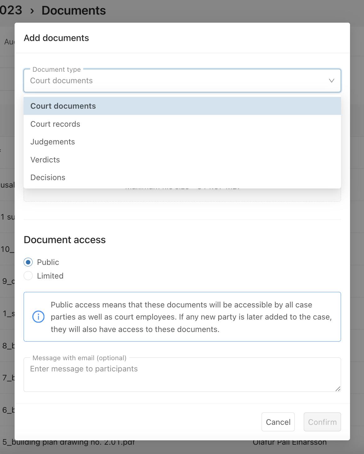 - Select the appropriate document type. The default type is “Court Document”. Depending on your user role, additional types (such as “Judgment”, “Court Record”, etc.) may be available.