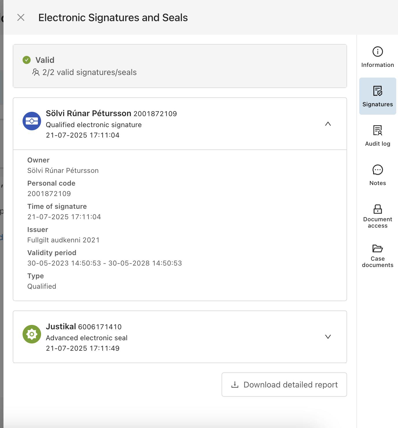 Justikal has a built-in validation service that verifies electronic signatures and seals, regardless of the solution used to generate them. This service is eIDAS-certified, ensuring compliance with European standards. Signature and seal information is displayed by clicking the upper right corner of each document's page. The validation service clearly shows whether the signature or seal uses a simple, advanced, or qualified trust service. The legal effect of these trust services is defined in Act No. 55/2019.